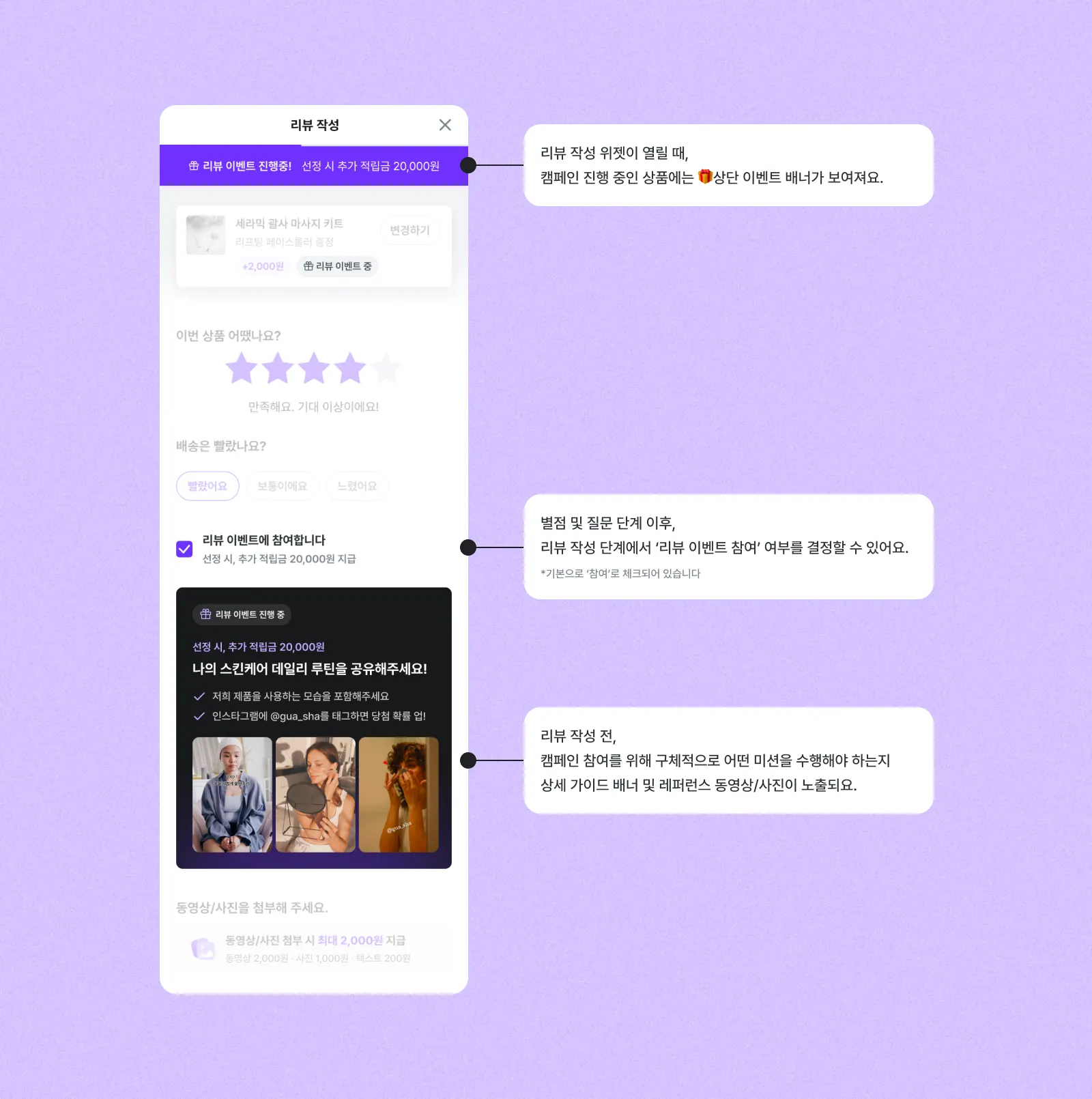 특정 상품이나 이벤트에 맞는 캠페인을 통해 원하는 형태의 리뷰를 올리도록 유도하고,