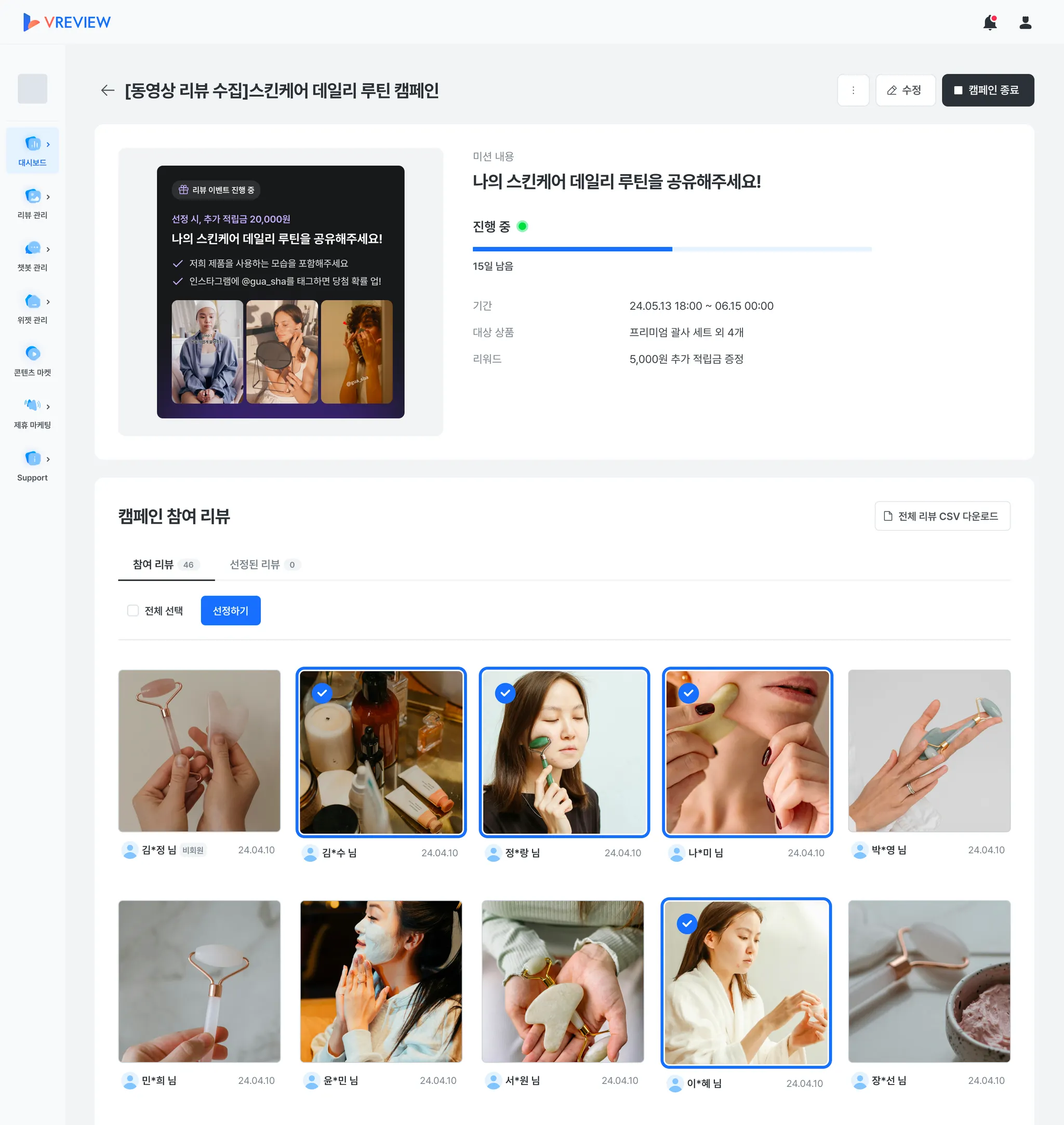 캠페인에 참여한 전체 리뷰 목록도 CSV로 다운로드 가능해요.