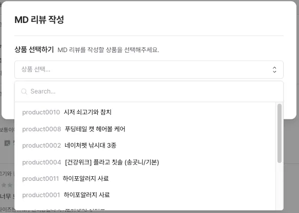 2. MD리뷰 작성할 상품 선택 (상품번호 or 상품명으로 검색 가능)