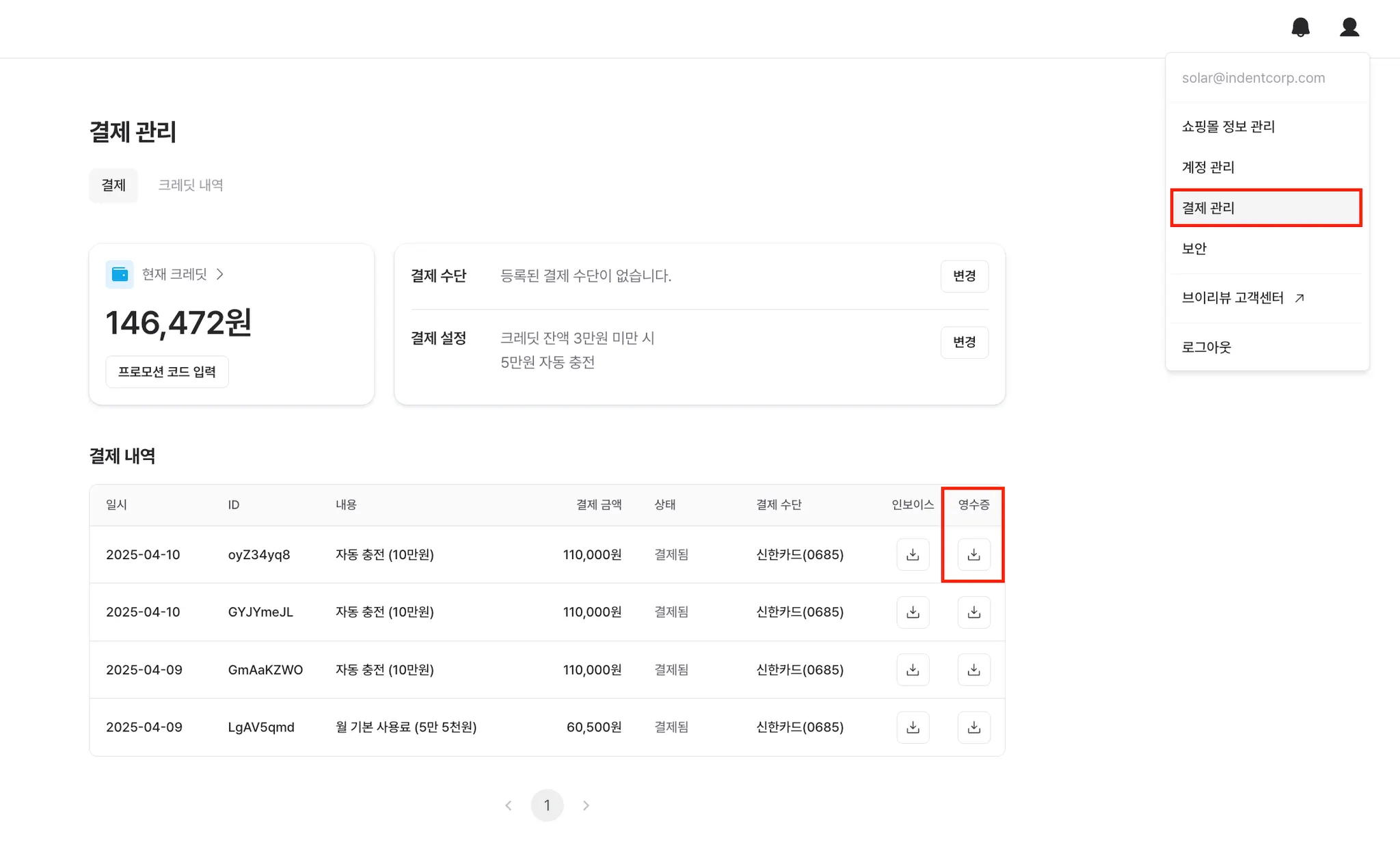 결제 금액 영수증은 브이리뷰 어드민 > 우측 상단